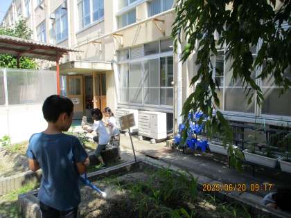 毎朝、朝の会の後にみんなで水やりをしてお世話しています。トマトの実ができたり、枝豆ができたり、1年生の植木鉢にはあさがおが咲いたりと育てている野菜や花が大きくなっています。