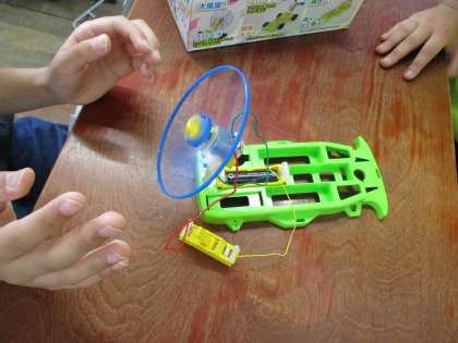 以前作った実験キットを使って、プロペラを回しました。風の向きが違うことに気づき、電池をつなぐ向きが逆になっていることを発見しました。