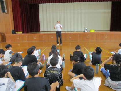 地域の人がこの体育館に避難してきたとき、どんな人がリーダーになるのか、どんなルールが必要か、自分たちは子どもだけどできることはないかなど、想像を広げながら考えていました。