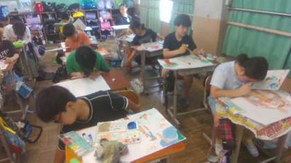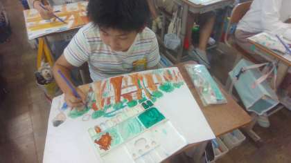 図工では、生活の中の出来事や体験、心に残ったことや様子を思い出して、その時に感じた自分の思いを重ねて、絵に表しています。