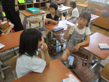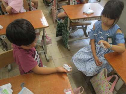 ひきざんの学習では、ひきざんのカードを使って、カードゲームをしました。互いに問題を出し合ったり、答えの「おおきさくらべ」をしたりして、楽しく学習する様子が見られました。