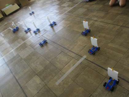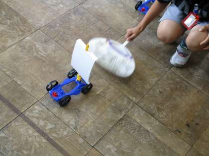 理科の学習で、風で走る車を作りました。子どもたちは、強い風と弱い風を試しながら、目標となる位置に車を上手にコントロールしていました。