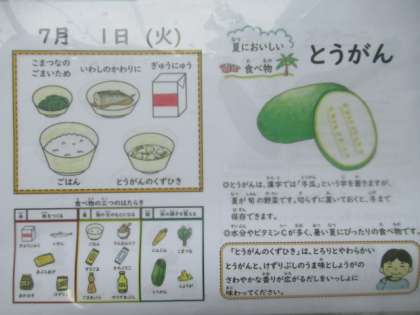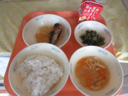 ごはん、牛乳、いわしのかわり煮、小松菜のごまいため、とうがんのくずひき