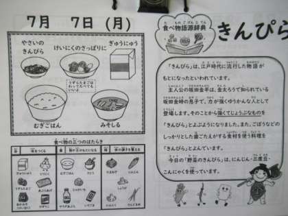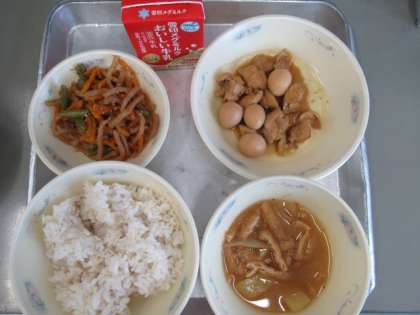 麦ごはん、牛乳、鶏肉のさっぱり煮、野菜のきんぴら、みそ汁