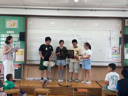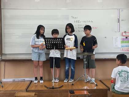 グループでどの楽器を使い、どのように演奏するかを話し合ってリズム打ちの練習をしました。最後にはみんなの前で発表しました。