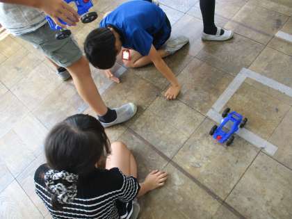 理科「風とゴムの力のはたらき」の学習で、ゴムの力の働きで走る車を作って走らせました。ゴムを伸ばす長さによって、車の進む距離が異なることに気づいていました。