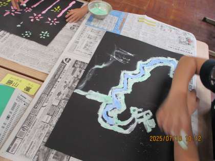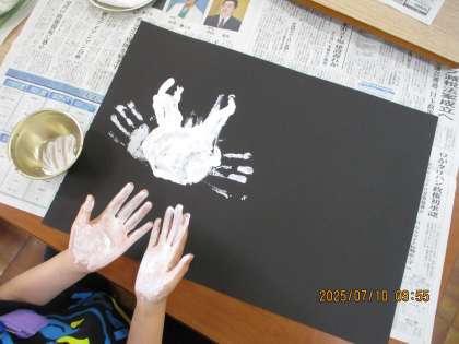 とろとろ絵の具を使って絵を描きました。指を使って絵の具を混ぜたり、指で絵の具をのばしたり、絵の具をはじいたり、感触を楽しみながら表現していました。