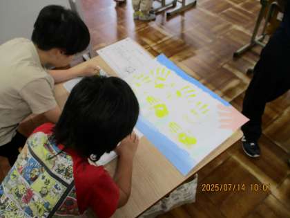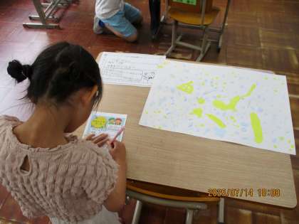 とろとろ絵の具の作品を鑑賞しました。友達の作品をじっくりと見て、いいなと思うところや素敵なところを見つけました。