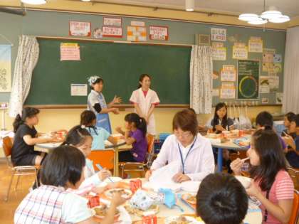 いつもは教室で食べていますが、場所が変わると、それだけでワクワクする子どもたち。いつも以上に、友達とのおしゃべりがはずんでいるようでした。