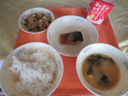 ごはん、牛乳、さばのつけ焼き、小松菜の煮びたし、みそ汁