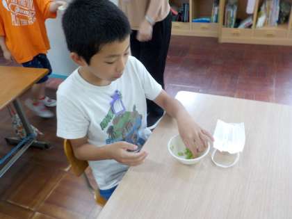 収穫したえだまめを調理して食べました。自分たちで育てたえだまめを「おいしい。」と味わって食べていました。職員室の先生にも食べてもらいました。