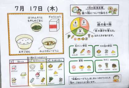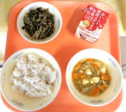 麦ごはん、牛乳、和風カレーどうふ、ほうれん草ともやしのごま煮