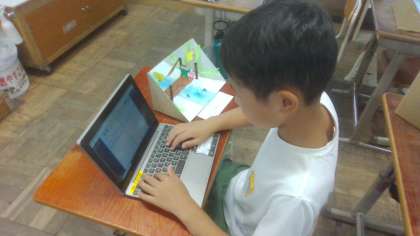 今日は、ミラクルミラーステージの鑑賞をしました。友達の作品をじっくり見て、感じたことを書く姿が見られました。