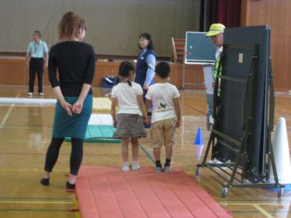 それからPTAの委員の方や地域ボランティアの方に用意していただいた道路に見立てたセットを使って,実際に正しい道路の歩き方を練習してみました。