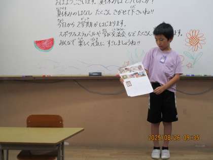 夏休みが終わり、昨日は2学期始業式でした。夏休み明け元気な子どもたちの顔を見ることができて嬉しく思いました。花火を見に行ったこと、お出かけしたこと、生き物のお世話をしたことなどたくさん夏休みの話を聞かせてくれました。2学期の目標決めもしました。沢山の行事がある2学期、めあてに向かって学習や色々な活動に取り組んでいければと思います。