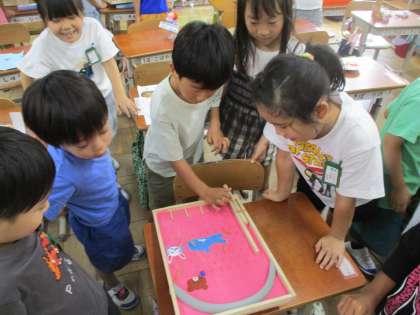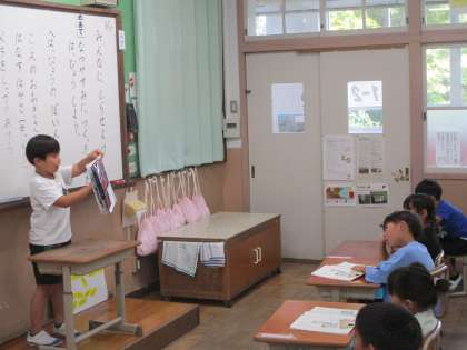 国語科の学習では、夏休みに取り組んだ自由課題の発表会をしました。発表会の後は、作品を見たり触ったりして、楽しむんで交流する姿が見られました。
