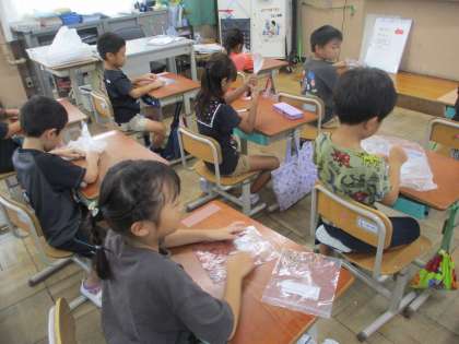 夏休みに集めていただいてた「あさがおのしぼんだ花」を使って、色水を作りました。濃い色がでるように一生懸命もみこんでいました。作った色水を使って、和紙に染める時には、慎重に色付けする姿が印象的でした。