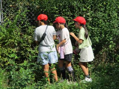 理科「こん虫のかんさつ」の学習で、昆虫などの虫を探しに校内散策を行いました。子どもたちは、草原の中や石の下、木の周りなどを中心に探していました。