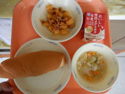 ミルクコッペパン、牛乳、豚肉のケチャップ煮、野菜のスープ