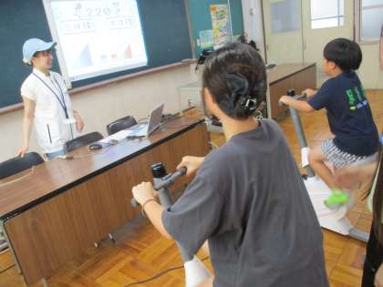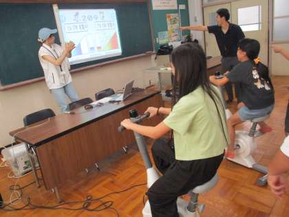 足こぎ発電をしています。子どもたちは、必死に発電用のバイクを回していました。