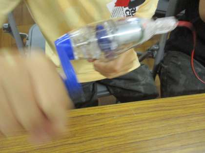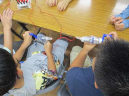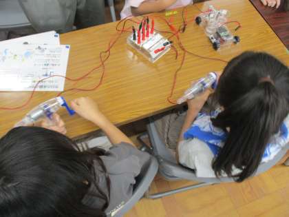 燃料電池による発電をしています。部品を組み立てて、手回し発電機も活用しながら、モーターカーを走らせようとしていました。