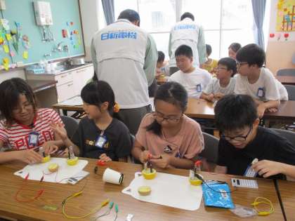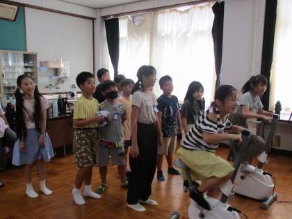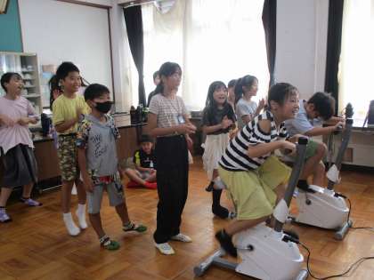 出前授業を通して、発電の方法がいろいろあることを学びました。2時間の学習で一生懸命にためた電力で、エアコンが3分つくほどでした。