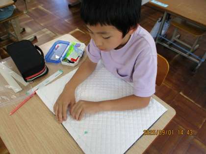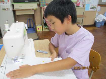 家庭科の学習でトートバッグ作りに取り組んでいます。昨年学習したミシンの使い方を思い出しながら、布に印を付け、ミシンで縫いました。慎重に縫い進めながら、真っすぐ縫うことができました。