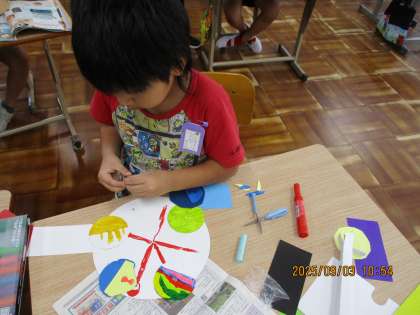 3年生の図工科の学習では、わりピンの回る仕組みを使って作品作りに取り組んでいます。観覧車や風車など回るものを思い浮かべながら、自分のイメージを形にしています。