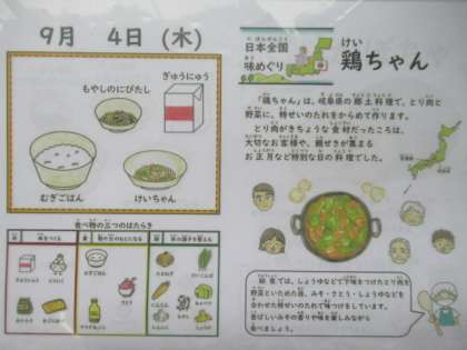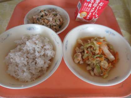 麦ごはん、牛乳、鶏ちゃん、もやしの煮びたし