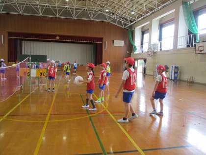 体育科「ソフトバレーボール」の学習では、ねらい2の活動をしています。簡単な攻め方(拾って、つなげて、返す)を工夫しながらゲームを楽しんでいます。