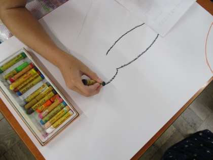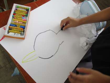 図画工作科の学習では、お話を聞いて思い浮かんだ様子を絵に表しています。イメージスケッチをもとに、線描を行いました。