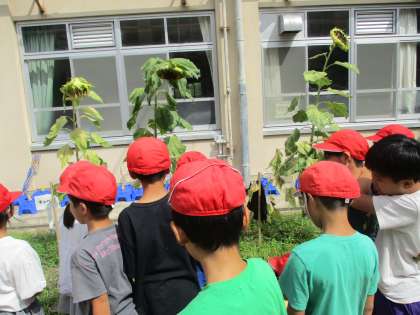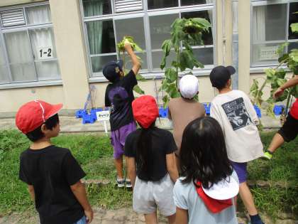 理科「植物の一生」の学習で、花が咲いた後の様子について観察しました。予想では「しなしなになる」「下を向く」「しょぼしょぼになる」「ぱりぱりになる」など、枯れることを子どもなりの言葉で表現していました。