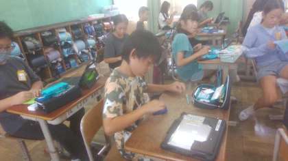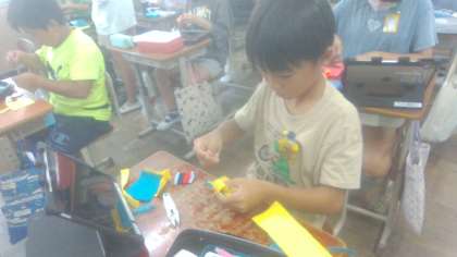 家庭科で針と糸を使って小物づくりに取り組んでいます。夏休みに一生けん命練習してきた人もいました。集中して取り組めました。