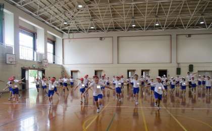 体育では、スポーツフェスティバルの練習をしています。だるまさんがころんだ♪を参考に、「だるまさんが魚になる」「だるまさんが波になる」「だるまさんが花火になる」…など、沖縄のイメージで出てきた言葉から、即興的に踊ってみました。おへそをたくさん動かして大きな動きが出来ていた人を、全体で紹介しました!