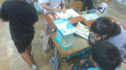 3年生の算数科では「重さ」の学習をしています。今日は秤を使って算数の教科書の重さを量りました。