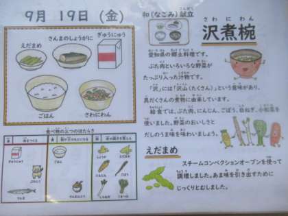 ごはん、牛乳、さんまのしょうが煮、えだ豆、沢煮椀
