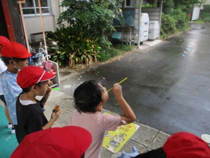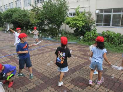生活科の学習では、しゃぼんだま遊びをしました。吹き方を工夫したり、道具を変えたりして、様々な大きさのしゃぼんだまを作って、楽しく遊ぶことができました。