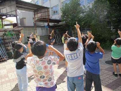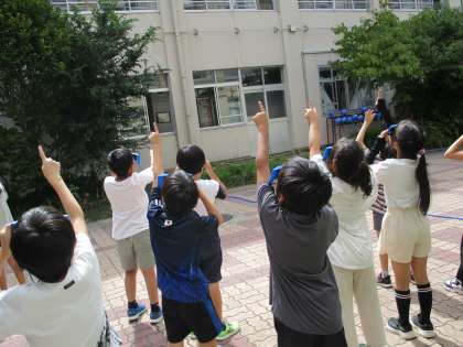 理科「かげと太陽」の学習で、影がどんなところにできるのかを考えました。影と反対側に太陽があると予想したので、実際に遮光板を使って太陽を観察しました。