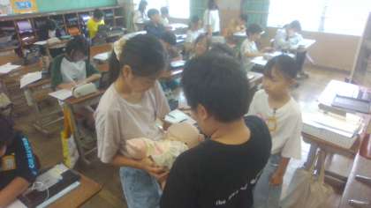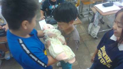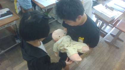 生まれてくる赤ちゃんの大きさの人形を抱っこしました。お腹の中に赤ちゃんが入っていることを思うと、お母さんがとても大変だということに気付いていました。
