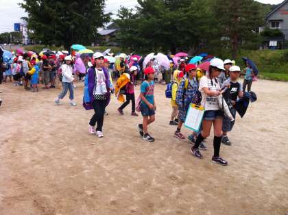 開会式後,出発しているところです。小雨が降ってきましたが,最後までポイントを回って学校に帰ってくる予定です。お弁当は,学校に帰ってから縦割りグループで食べます。1位はどのチームでしょうか。ファイト!