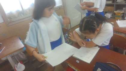 算数の授業で通分の仕方を考え、友達に一生懸命説明していました。