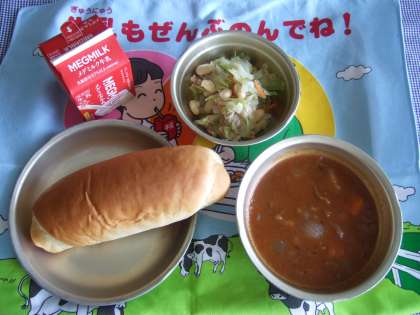 味付けコッペパン 牛乳 トマトシチュー 大豆とキャベツのソティ