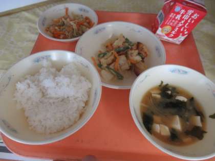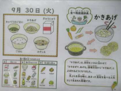 ごはん、牛乳、かきあげ、キャベツのごま煮、みそ汁