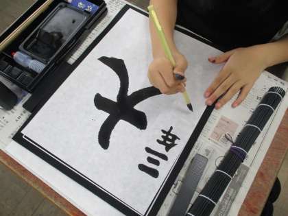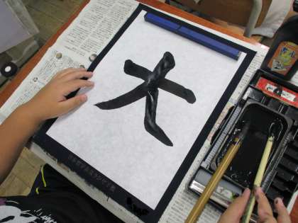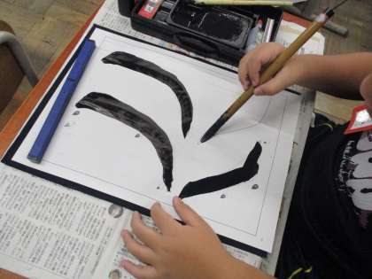 書写の学習で、毛筆を使って「大」という字を書きました。「はらい」の筆使いに気を付けながら書きました。
