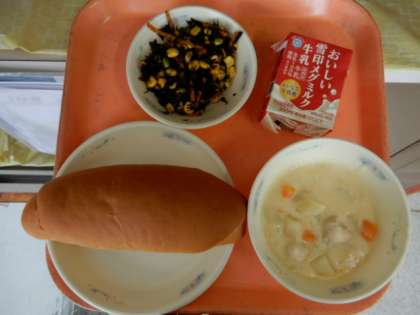 味つけコッペパン、牛乳、じゃがいものクリームシチュー、ひじきのソテー