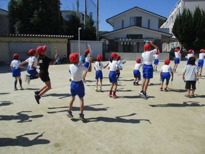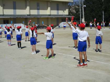 スポーツフェスティバルに向けて、運動場で4年生と団体演技の合同練習を行いました。
