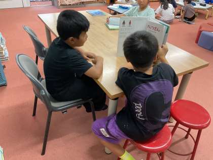 今日は図書館に行って、読み聞かせをする本を選びました。