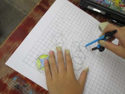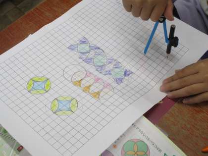 算数科の学習で、コンパスの使い方を学んでいます。ただ円を描くだけでなく、円で模様づくりをしました。