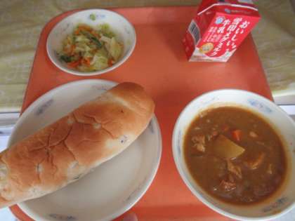 おさつパン、牛乳、チキンシチューカレー、ソテー