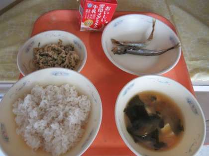 麦ごはん、牛乳、焼きししゃも、切干大根の煮つけ、なめこのみそ汁
